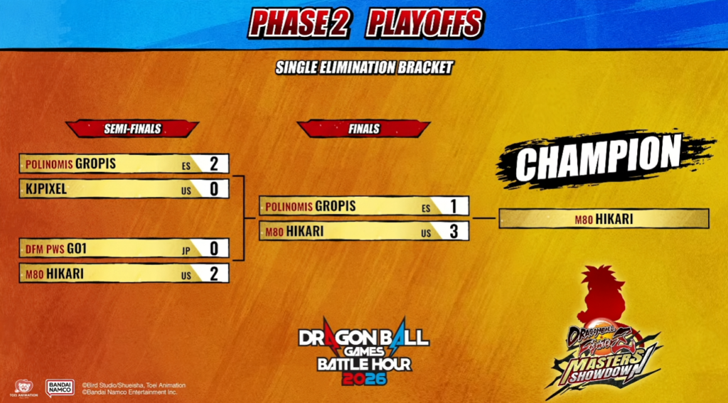 La parte competitiva también volvió a tener bastante peso dentro del Battle Hour. El Dragon Ball FighterZ Masters Showdown cerró su cuadro final con M80 Hikari como campeón del torneo tras imponerse por 3-1 a Polinomis Gropis en la final. Antes de eso, Polinomis Gropis había superado por 2-0 a KJpixel en semifinales, mientras que Hikari hizo lo propio con un 2-0 frente a DFM PWS GO1.