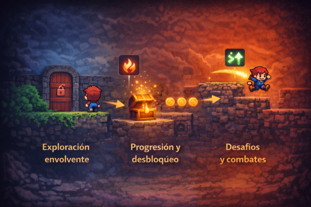 Un metroidvania es un juego de acción, exploración y progresión que suele desarrollarse en un mapa interconectado. En lugar de avanzar por niveles completamente separados, el jugador recorre un mundo unido por distintas zonas, atajos, bloqueos y caminos alternativos que se van abriendo conforme consigue nuevas habilidades.